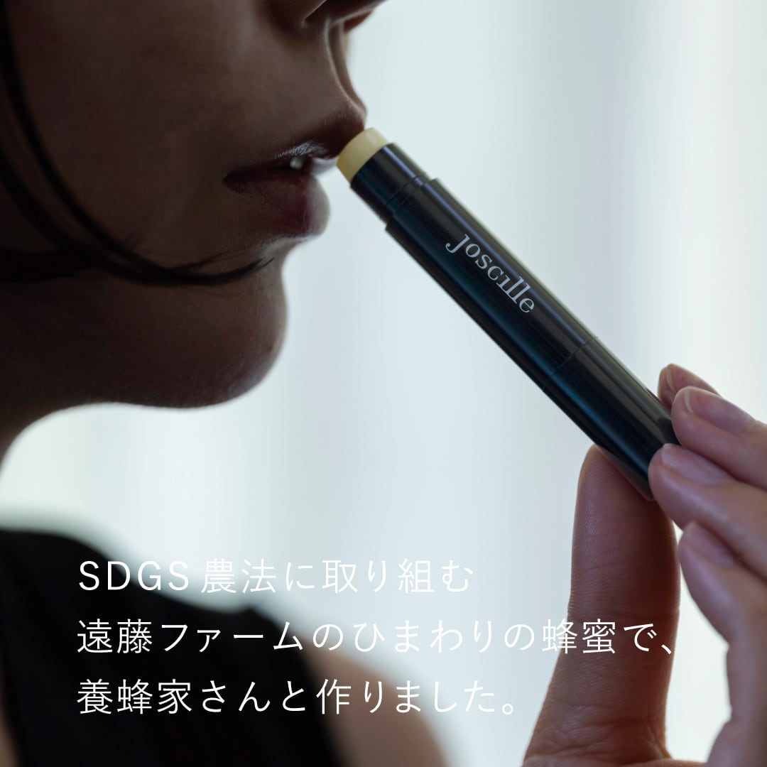 旅するジョシーユの蜂蜜のリップバームは、今回、代々木のマーケットの出店で知り合った遠藤ファームさんの希少なひまわりの蜂蜜を贅沢に使っています。その農法についてお聞きしてとても感動しました。近年の猛暑で蜂蜜も農業も過酷な作業になっている中、真摯に地球と向き合っている姿は本当に素晴らしいと思います。口紅はほとんどつけないので、このリップバームでいつも潤いのあるふっくらとした唇でいられますように。今井