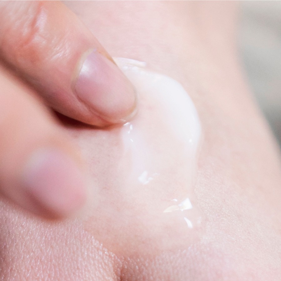 お肌には、あずき大くらいをとり、指先であたためながらこすらずに薄く伸ばします。